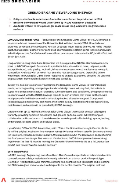 LONDON, 8 December 2025 – Production of the Grenadier Game Viewer by INEOS Kavango, a bespoke in-house conversion of the Grenadier 4X4, will start in early 2026. Unveiled as a prototype concept at the Goodwood Festival of Speed, Travel Indaba and We Are Africa through 2024, the Grenadier Game Viewer generated enormous interest from game reserves and luxury safari lodges across Sub-Sahara Africa and from ranches and estates in the US, Middle East and South East Asia.