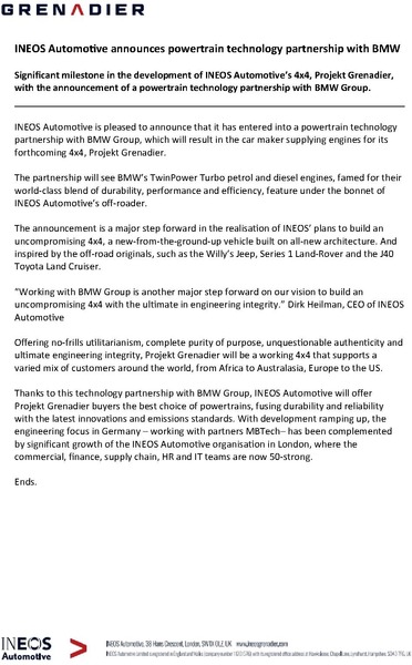INEOS Automotive is pleased to announce that it has entered into a powertrain technology partnership with BMW Group, which will result in the car maker supplying engines for its forthcoming 4x4, Projekt Grenadier.