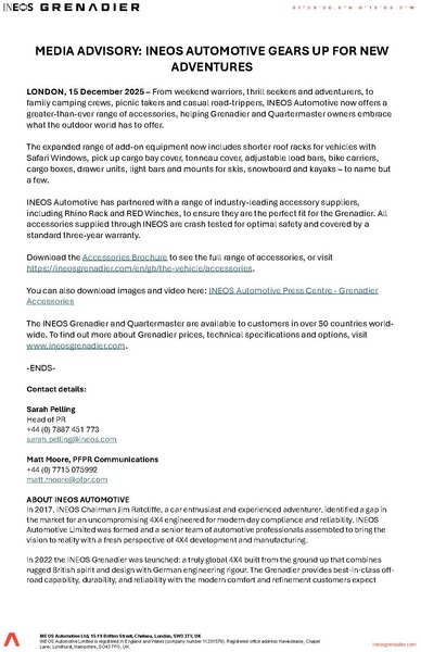 LONDON, 15 December 2025 – From weekend warriors, thrill seekers and adventurers, to family camping crews, picnic takers and casual road-trippers, INEOS Automotive now offers a greater-than-ever range of accessories, helping Grenadier and Quartermaster owners embrace what the outdoor world has to offer.
